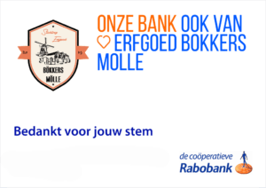 De gelden worden besteed aan de aanschaf van informatieborden voor de Bökkers Mölle en het Pakhuis (wellicht bekend als de bruine anwb informatieborden). Namens stichting Erfgoed Bökkers Mölle – Heel Veel Dank aan allen die gestemd hebben! We houden je op de hoogte als de borden gereed zijn!